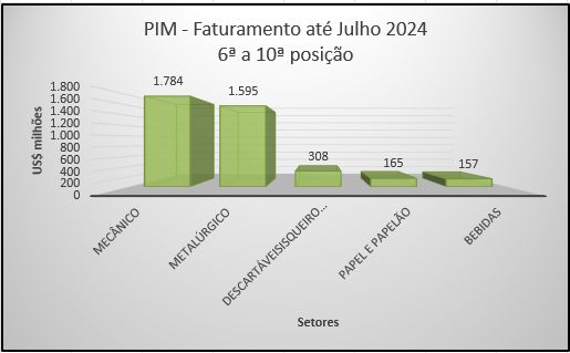 Com 18,27% do faturamento total do Polo Industrial de Manaus em 2024, os subsetores que ocupam da 6ª à 10ª posições, faturaram US$ 4.00 bilhões. Assim, aos demais 14 subsetores coube o faturamento de US$ 739 milhões, valor que representa 3,36% das vendas do PIM.
