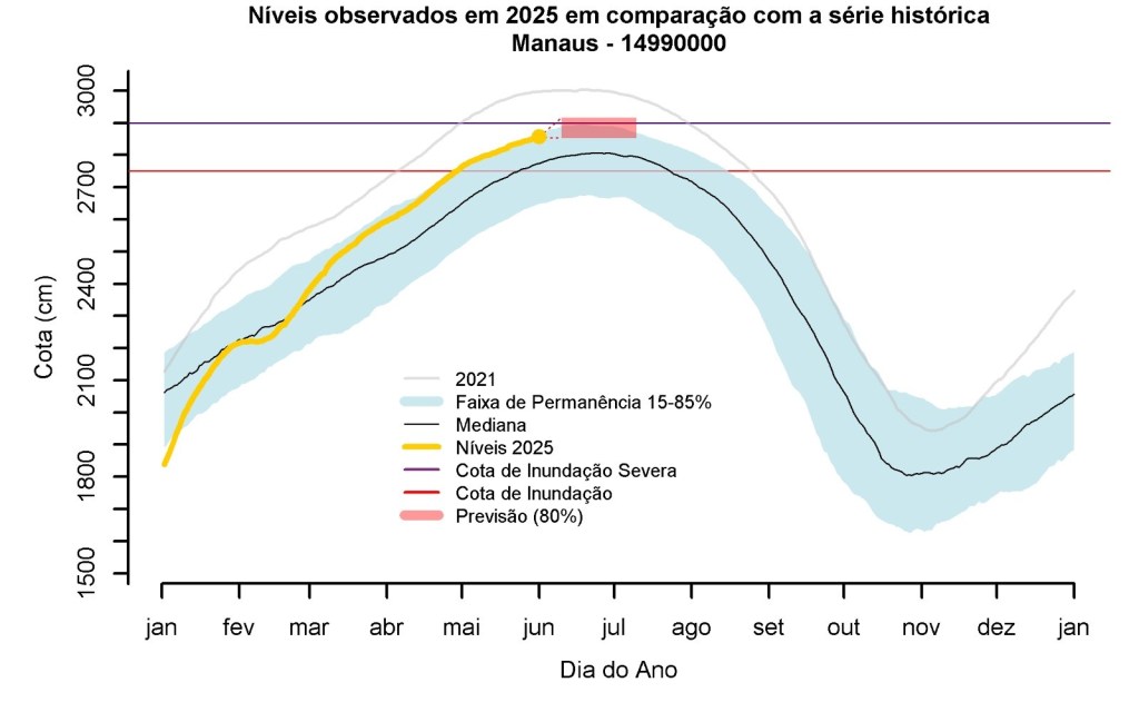 De acordo com o alerta, a previsão é que o rio Negro atinja 28,84 metros em Manaus, com uma margem de variação entre 28,56 m e 29,16 m. A probabilidade de alcançar a cota de inundação severa, que é de 29 metros, é de 35%. Já a chance de superar o recorde histórico de 30,02 metros, registrado em 2021, é inferior a 1%.